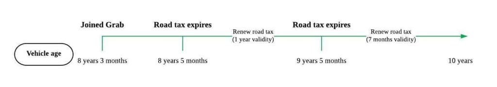 Contohnya: Jika kenderaan anda berumur 9 tahun dan 5 bulan apabila cukai jalan anda tamat tempoh, anda hanya boleh memperbaharuinya sehingga 10 tahun.